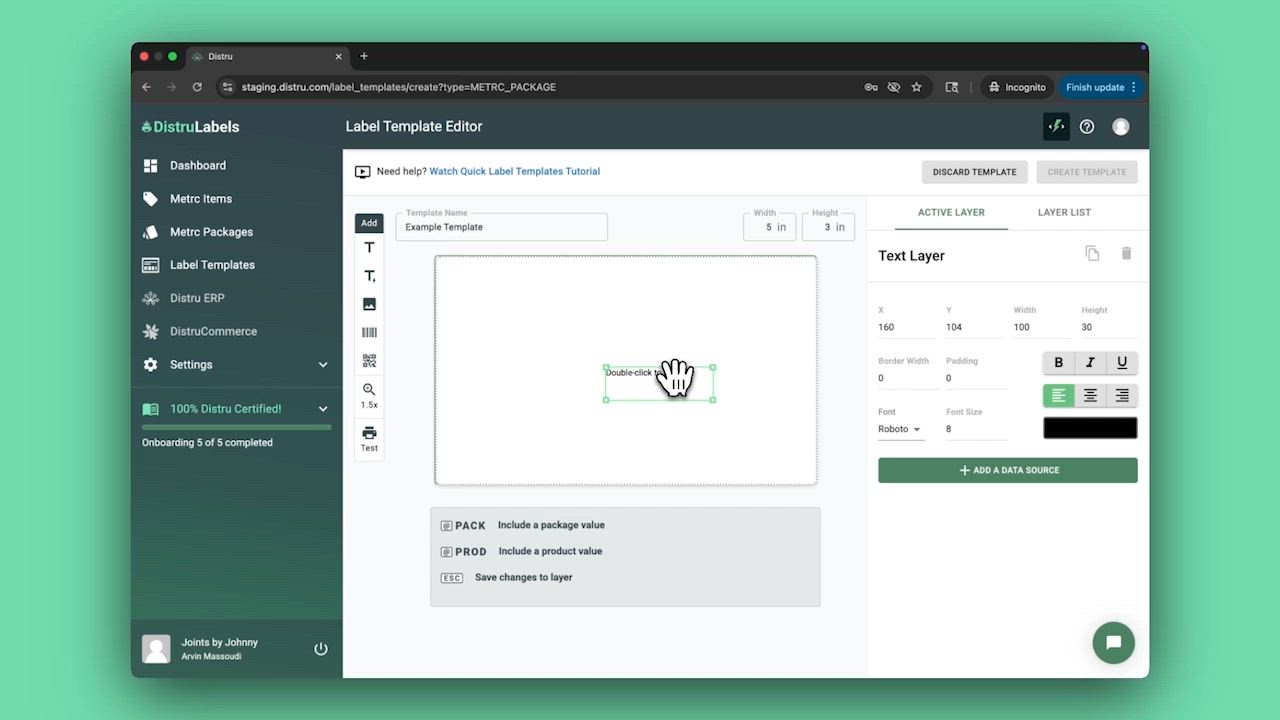 Build and edit templates with custom fields, layouts, and data pulled directly from METRC.